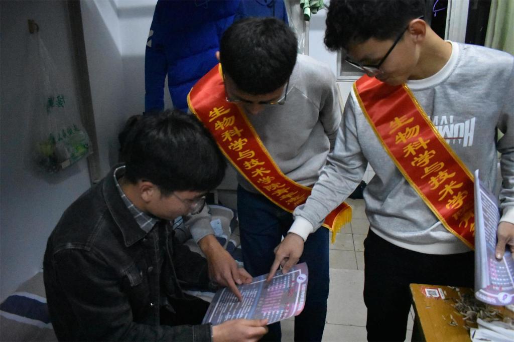 首先,志愿者们依次检查了各个宿舍的安全用电情况,对存在的安全隐患仔细排查,并向同学们认真讲解在宿舍中应该注意的安全问题,如宿舍内禁止使用高功率电器、禁止乱拉接电线等,并为每个宿舍发放了消防安全宣传单页,提醒同学们增强安全意识,坚决遏制季节交替时期火灾高发的势头。同时,志愿者们为同学们介绍了一些突发情况下的自救常识,并鼓励同学们在平时多多了解此方面的安全知识,同学们也纷纷表示之后会更加注意重视宿舍的消防安全问题、杜绝宿舍中的不良习惯,在平时不断学习安全知识,从一点一滴做起,坚决杜绝安全事故的发生。