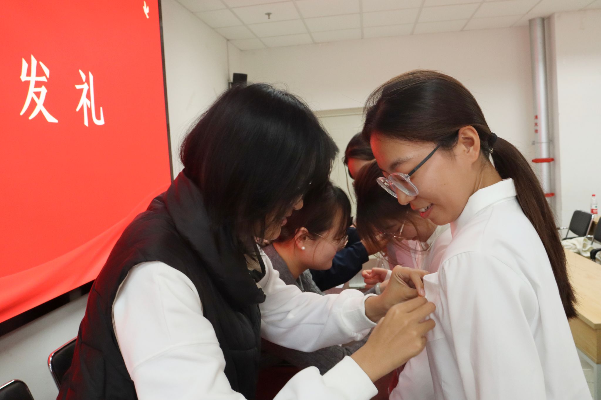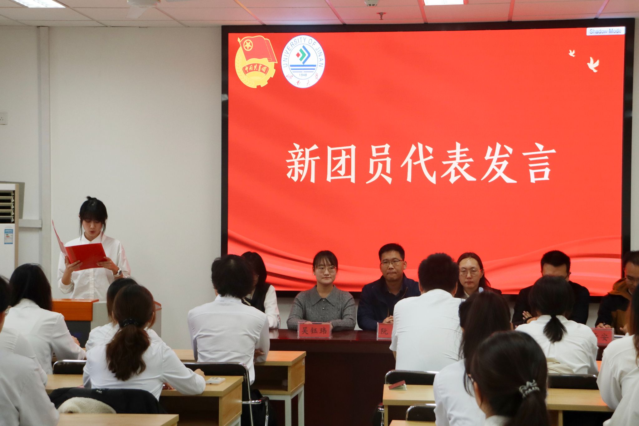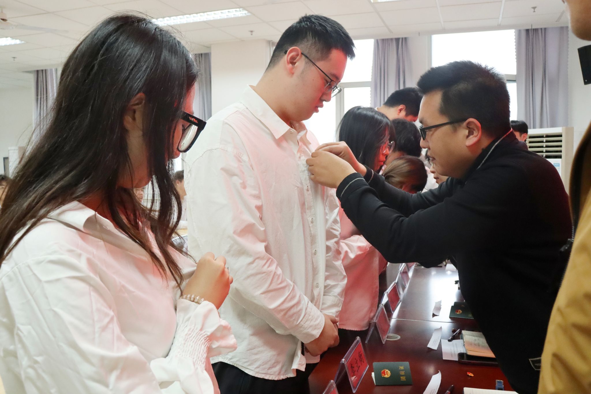 团委书记吴钰玮老师宣读学院2024年下半年新发展团员名单,全体辅导员老师逐一向新发展团员颁发团员证并为他们佩戴团徽,从团徽戴上的那一刻起,责任与使命也刻进团员们的内心。