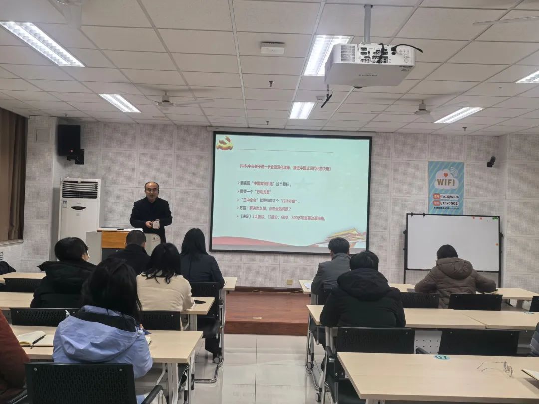 为深入学习贯彻党的二十届三中全会精神,凝聚改革共识,激发奋进力量,推动全会精神在学院落深落细、见行见效,12月19日,学院开展主题党日活动,邀请马克思主义学院副教授梁栋为全体教工党员作了题为《宣传贯彻党的二十届三中全会精神》的专题报告。报告会由学院党委书记史国普主持。