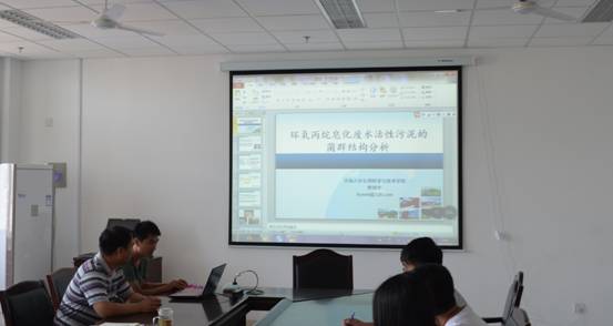 樊祥宇老师在报告中详细的介绍了环氧丙烷皂化废水的危害,活性污泥处理此皂化废水的流程,利用高通量测序技术及生物信息学方法研究了污泥宏基因组中的菌群结构,并将曝气池和接触氧化池的菌群结构和废水的处理能力进行了关联分析。樊祥宇老师深入浅出的报告引起了与会老师和同学们的浓厚兴趣,大家围绕报告以及进一步可能的研究和合作方向进行了深入的讨论。