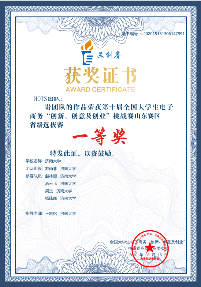 经过校赛的评选,全省共36所高校的1150件作品进入省赛初级赛,并有160支队伍从中脱颖而出进入中级赛。我院由王凯铭老师指导、苏雨菲同学为团队负责人的作品《智云药材为打造优质云上中药材的航母级平台》荣获一等奖。智云药材是一个区域式的中药材产品营销服务商,解决了特色中药材产品存在的优质中药材无品牌、销售渠道单一质量不稳定、缺乏标准等问题。项目以校、行、企+合作社的模式开展,打造出具有特色品牌的区域性产品,形成产业链发展趋势,为当地经济作物打开销路、提高效益,带动当地的经济发展,助力乡村振兴。