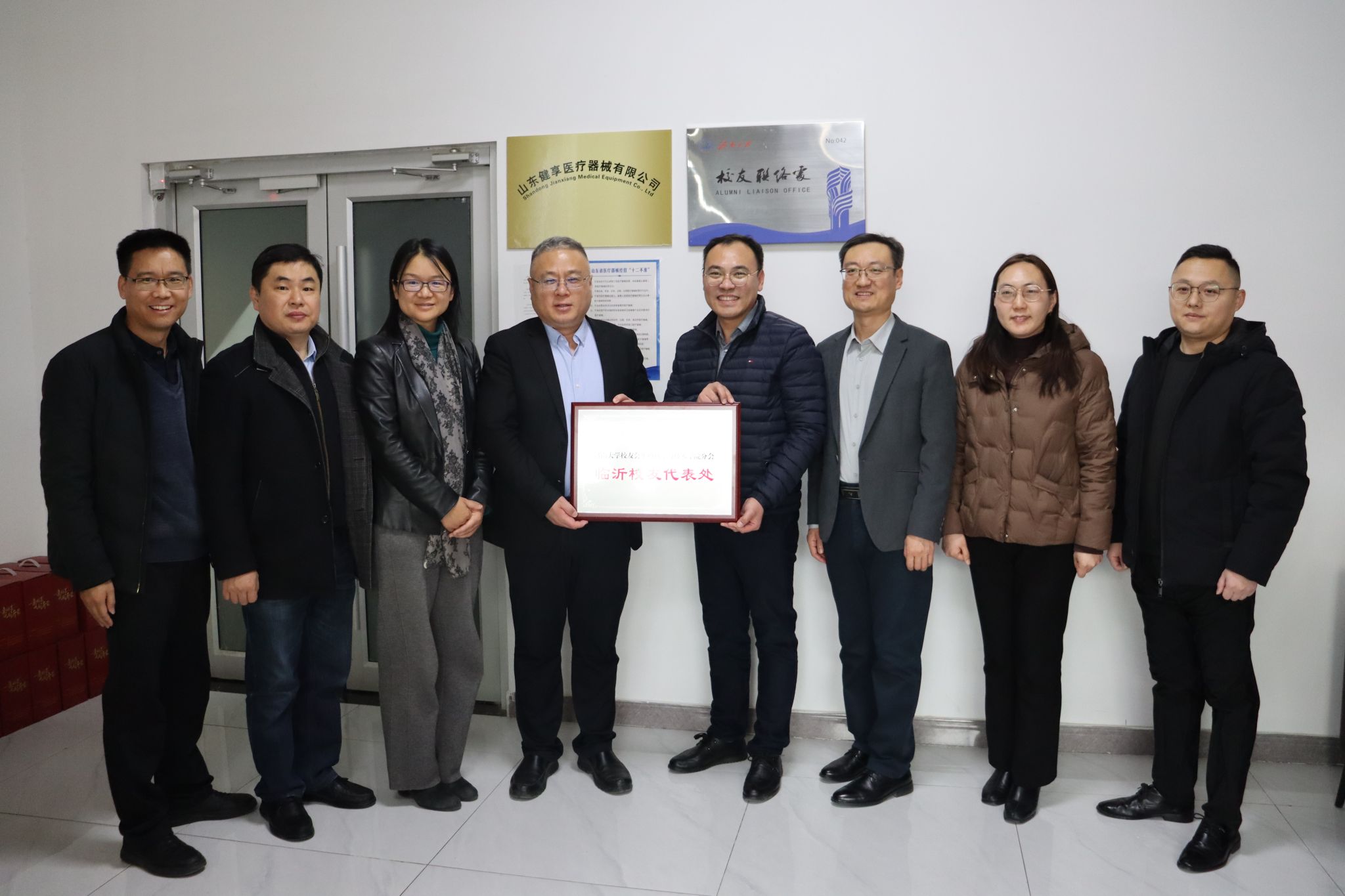 1月14日,德赢ac米兰官方合作校友会德赢winac米兰分会临沂校友代表处在山东健享医疗器械有限公司成立。学校党委常委、副校长黄加栋出席活动,德赢ac米兰官方合作临沂校友会会长李子燕、德赢ac米兰官方合作临沂校友会秘书长、德赢ac米兰官方合作校友会德赢winac米兰分会副会长2012届校友李衡、学院班子成员、教师代表、临沂校友代表参加活动。