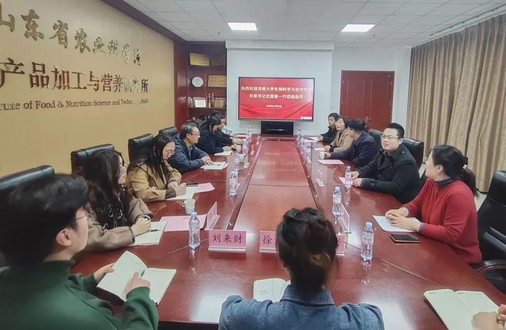 刘开昌对学院一行的到来表示热烈欢迎,并简要介绍山东省农业科学院学科团队、成果转化、科技服务等方面基本情况,希望双方进一步密切人才团队交流,深化生物科技领域合作及成果培育,不断推进研究生培养质量提升,为推动农业科技创新事业发展做出更大贡献。史国普对山东省农业科学院为学院师生科研提升和人才培养提供的支持表示感谢。希望双方加大研究生联合培养力度,充分发挥人才、学科、成果等方面优势,拓展合作领域,丰富合作内涵,鼓励相关领域研究团队围绕山东省重大产业需求共同开展项目申报、技术攻关等工作,积极探索共建科研平台并支持学校生物学博士点申报,不断将合作落实落地,促进双方高质量发展。