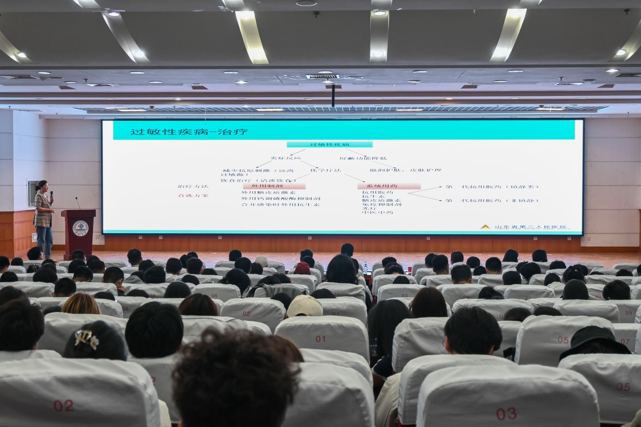 李龙介绍了山东省第二人民医院及其博士志愿服务团基本情况。医院博士志愿服务团成员,皮肤科主任张璇、脊柱外科主任惠文鹏、眼科副主任刘卫卫结合临床医学经验,以通俗易懂的语言、生动有趣的案例,分别为学生讲解了常见皮肤病、腰间盘突出症、近视、干眼症等疾病相关症状以及预防与治疗方法,同时,还对大学生健康生活方式提出了实用型建议。